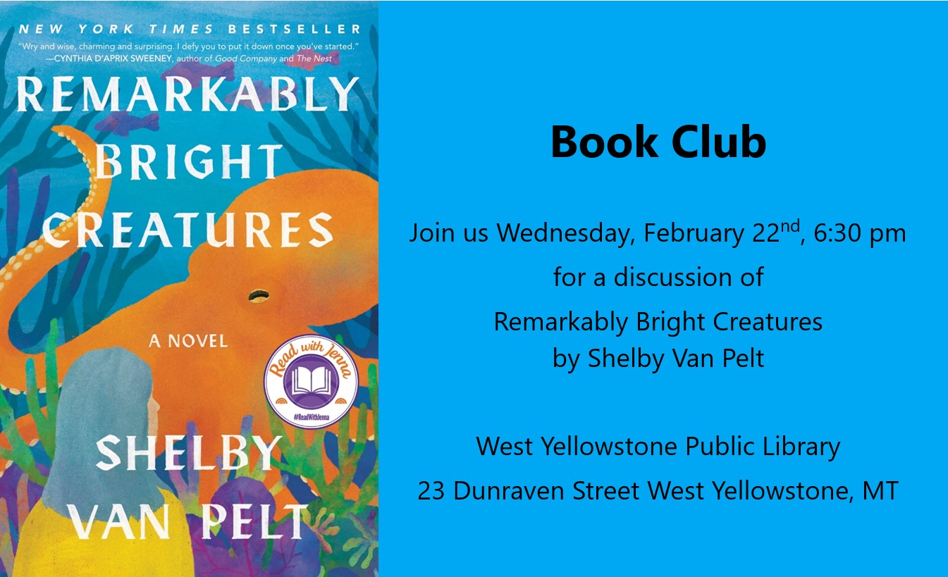 Date Feb 22 2023 Expired! Time 6:30 pm - 7:30 pm West Yellowstone Public Library Book Discussion: Remarkably Bright Creatures West Yellowstone Public Library Book Club Remarkably Bright Creatures by Shelby Van Pelt Wednesday, February 22, 6:30 PM West Yellowstone Public Library + Add to Google Calendar + iCal / Outlook export