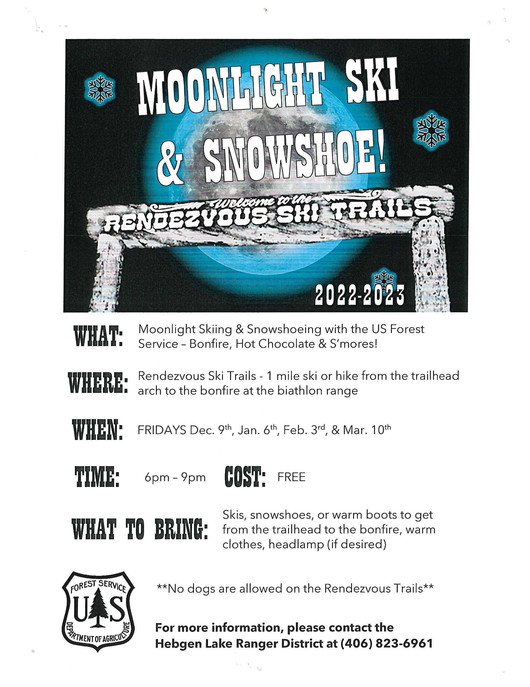 What:                    Moonlight skiing & snowshoeing with the U.S. Forest Service – Bonfire, Hot Chocolate & Smores