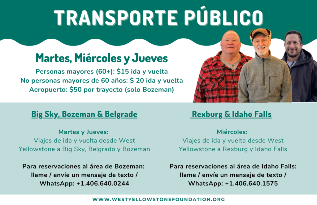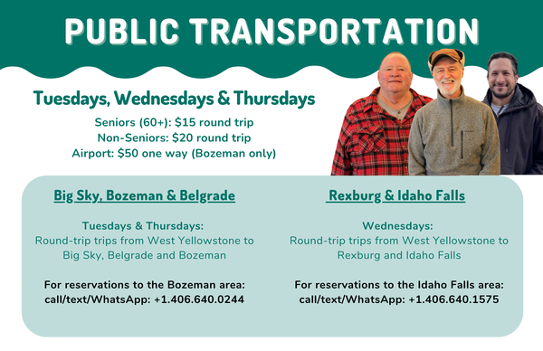 West Yellowstone Foundation Public Transit Bus Date Dec 16 2025 Time All Day West Yellowstone Foundation Public Transit Bus West Yellowstone Foundation Public Transit Bus Transportation from West Yellowstone to Big Sky, Belgrade, Bozeman and back Tuesdays & Thursdays For reservations call or text: (406) 640-0244 + Add to Google Calendar + iCal / Outlook export 00 days 00 hours 00 minutes 00 seconds Location West Yellowstone Foundation