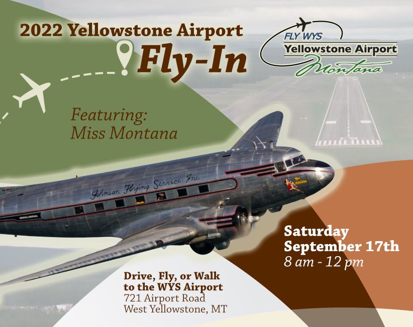 Date Sep 17 2022 Expired! Time 8:00 am - 12:00 pm Yellowstone Airport Fly-In Featuring Miss Montana + Add to Google Calendar + iCal / Outlook export