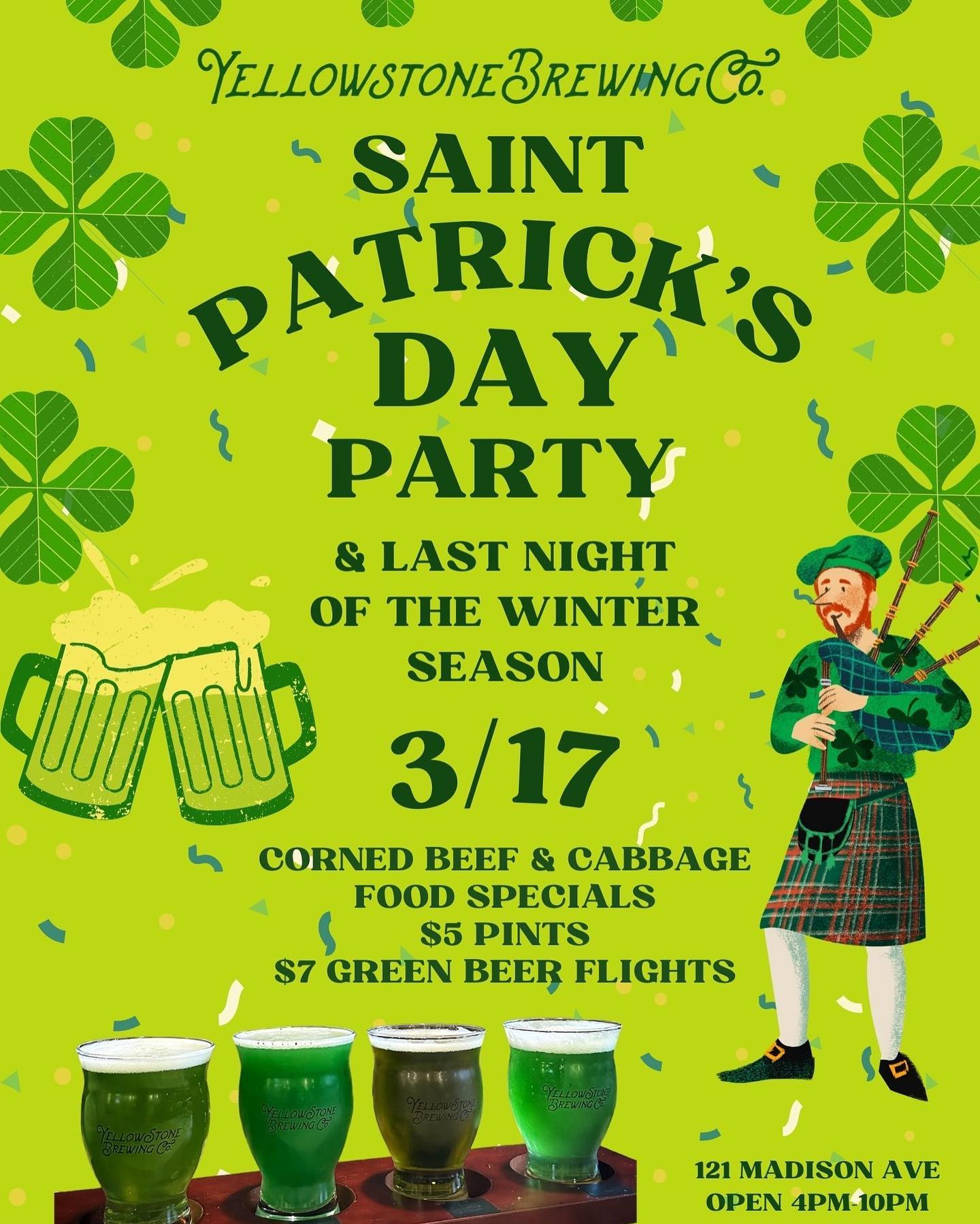 Yellowstone Brewing Company Saint Patrick’s Day Party Date Mar 17 2023 Expired! Time 4:00 pm - 10:00 pm Yellowstone Brewing Company Saint Patrick’s Day Party Yellowstone Brewing Company Saint Patrick’s Day Party 121 Madison Avenue March 17, 2023 4:00 PM – 10:00 PM Food & Drink Specials + Add to Google Calendar + iCal / Outlook export Location Yellowstone Brewing Company
